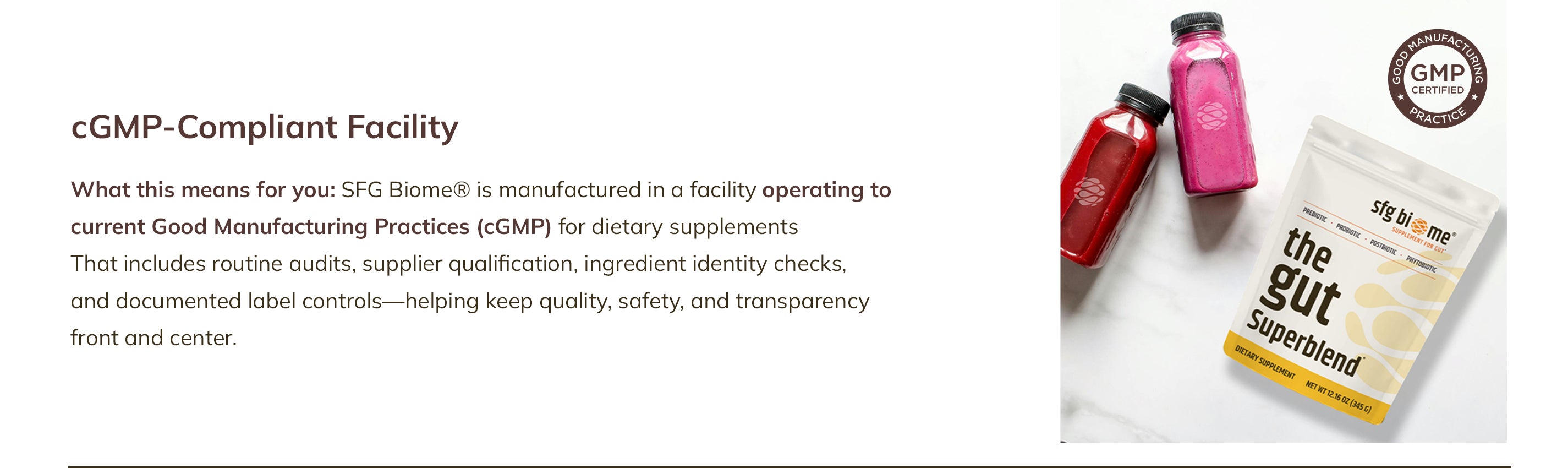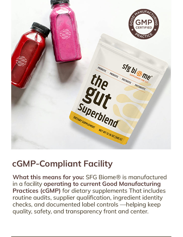 Your gut deserves clean, consistent nutrition. We screen ingredients and finished product for microbes, heavy metals, common allergens, and label-claim accuracy, and we manufacture in a cGMP-compliant facility. The result: a blend you can trust, in one easy scoop.
